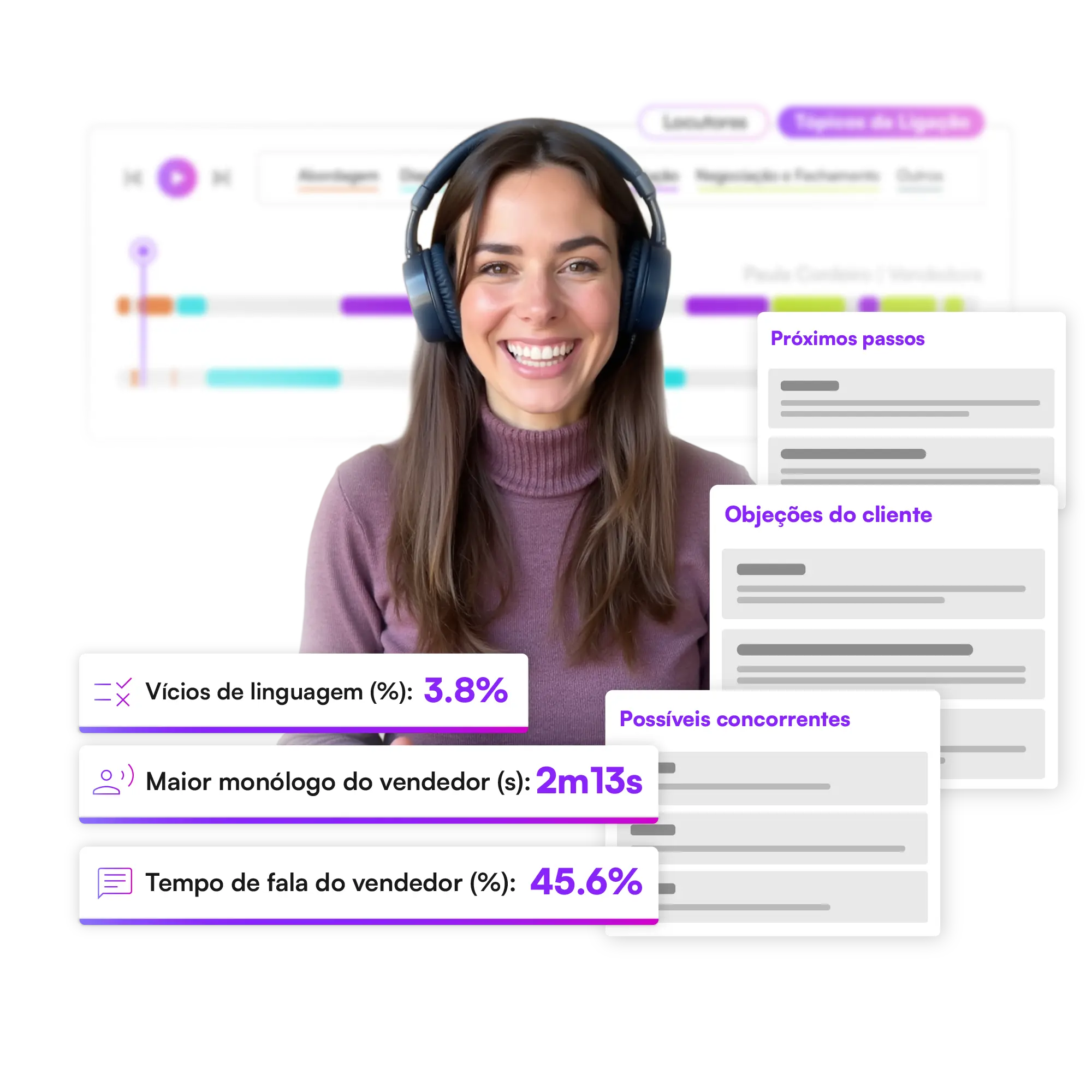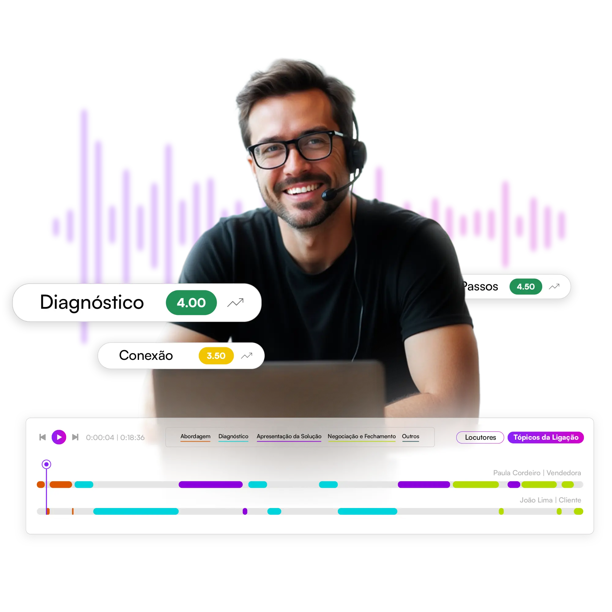 Nossa ferramenta analisa entonação, ritmo e musicalidade da voz, mede o grau de prolixidade, identifica repetições e vícios de linguagem, transformando cada interação em dados estratégicos para capacitar equipes de vendas, marketing, produto e CS.