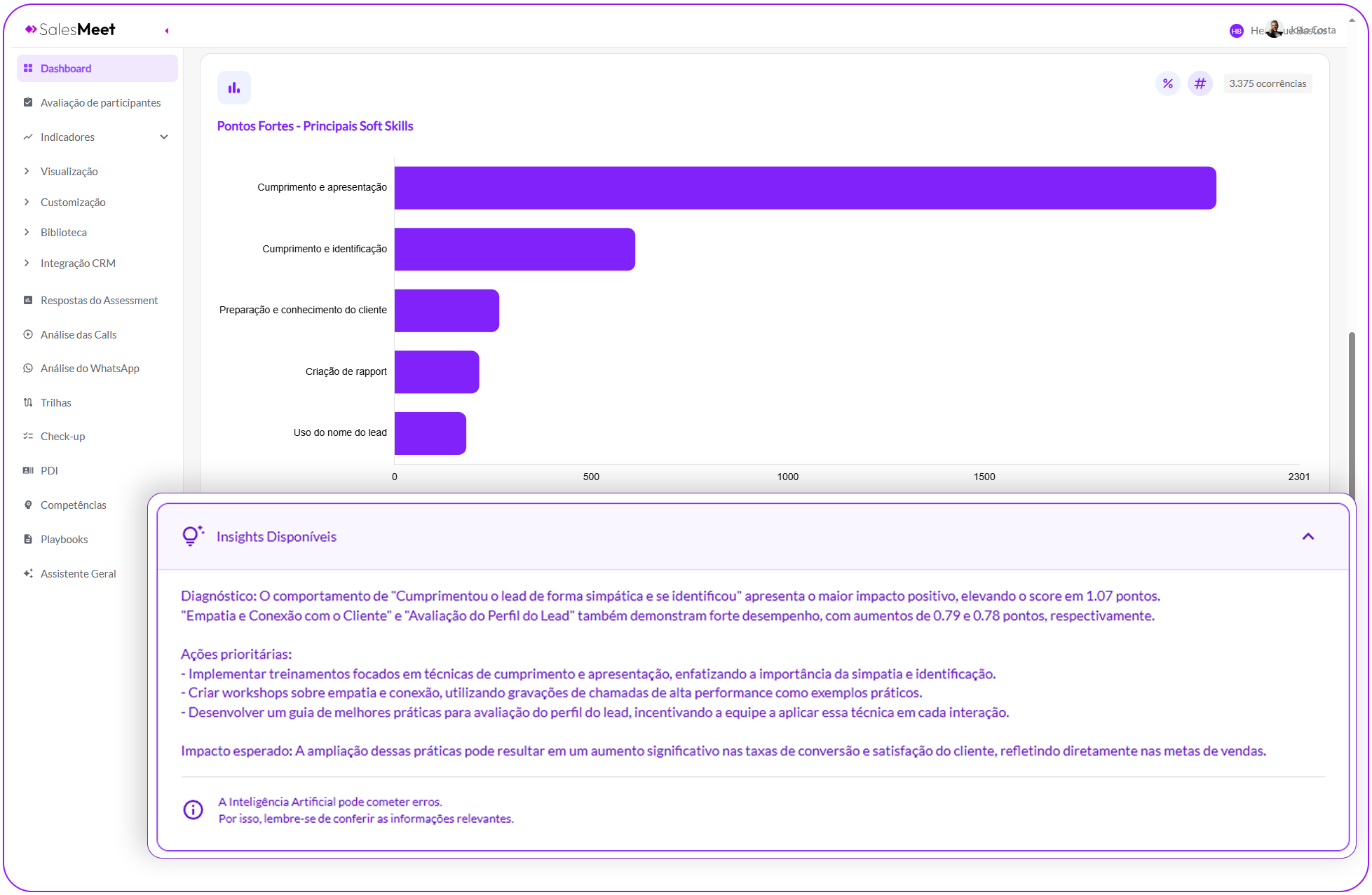 A SalesMeet identifica comportamentos, etapas, riscos, objeções, argumentos e próximos passos. Os dados alimentam dashboards, recomendações, PDIs e trilhas de desenvolvimento.