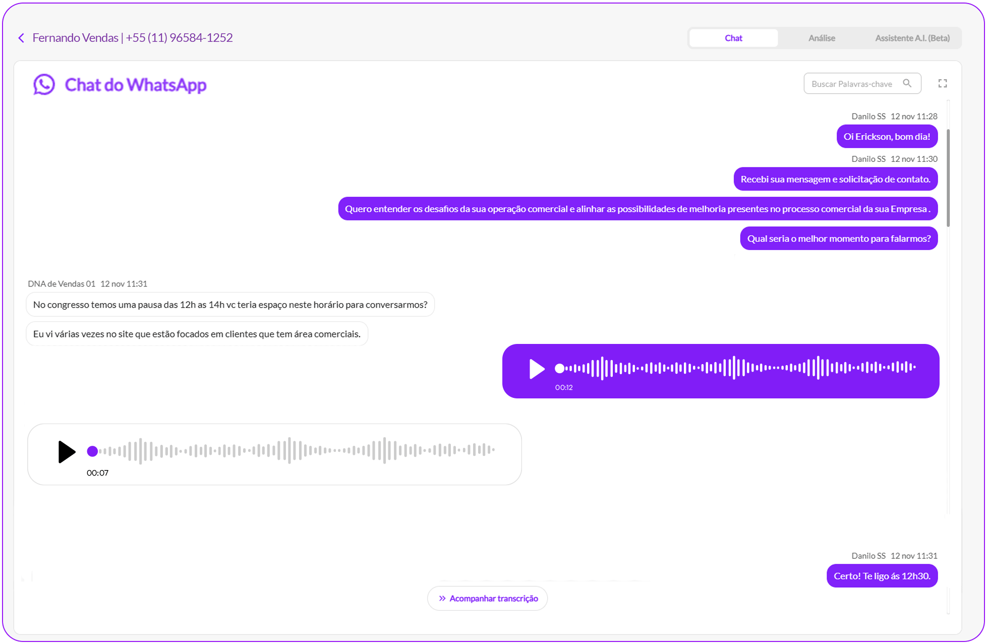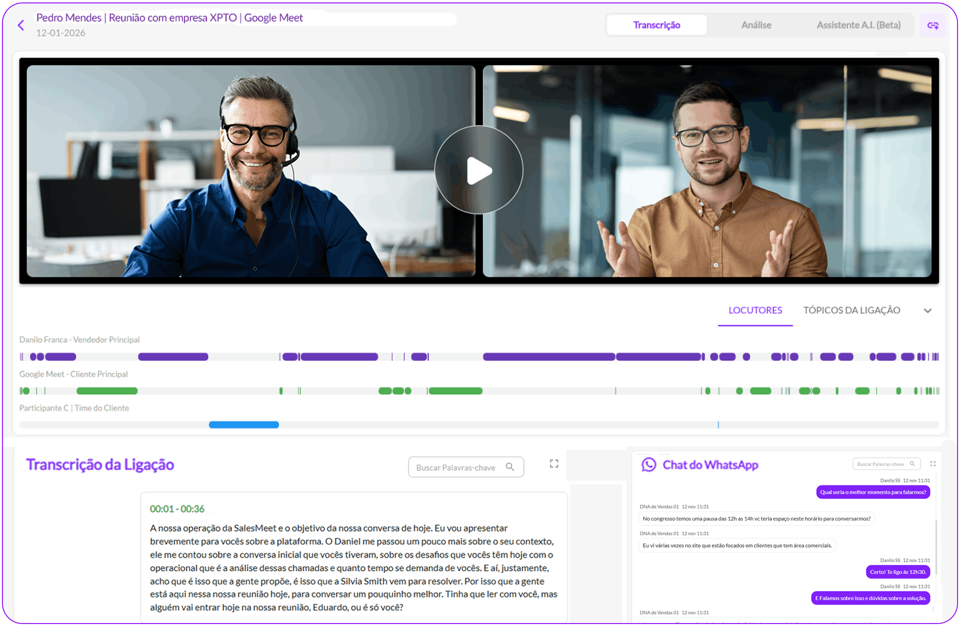 Aumente a produtividade e gere inteligência de dados a partir da análise de todas as conversas do seu time de vendas: reuniões por vídeo, ligações, WhatsApp e interações presenciais.