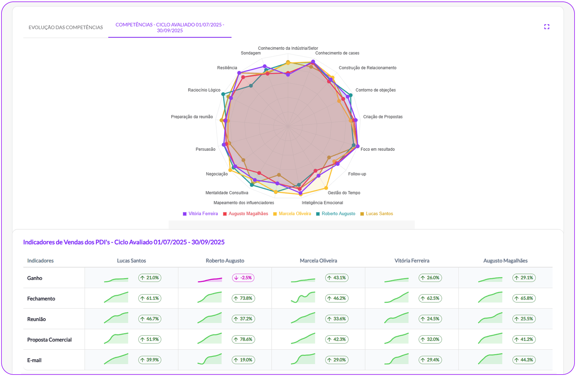 Sim. Todos os insights podem alimentar trilhas, PDIs e rotinas de capacitação na SalesMeet Edu.