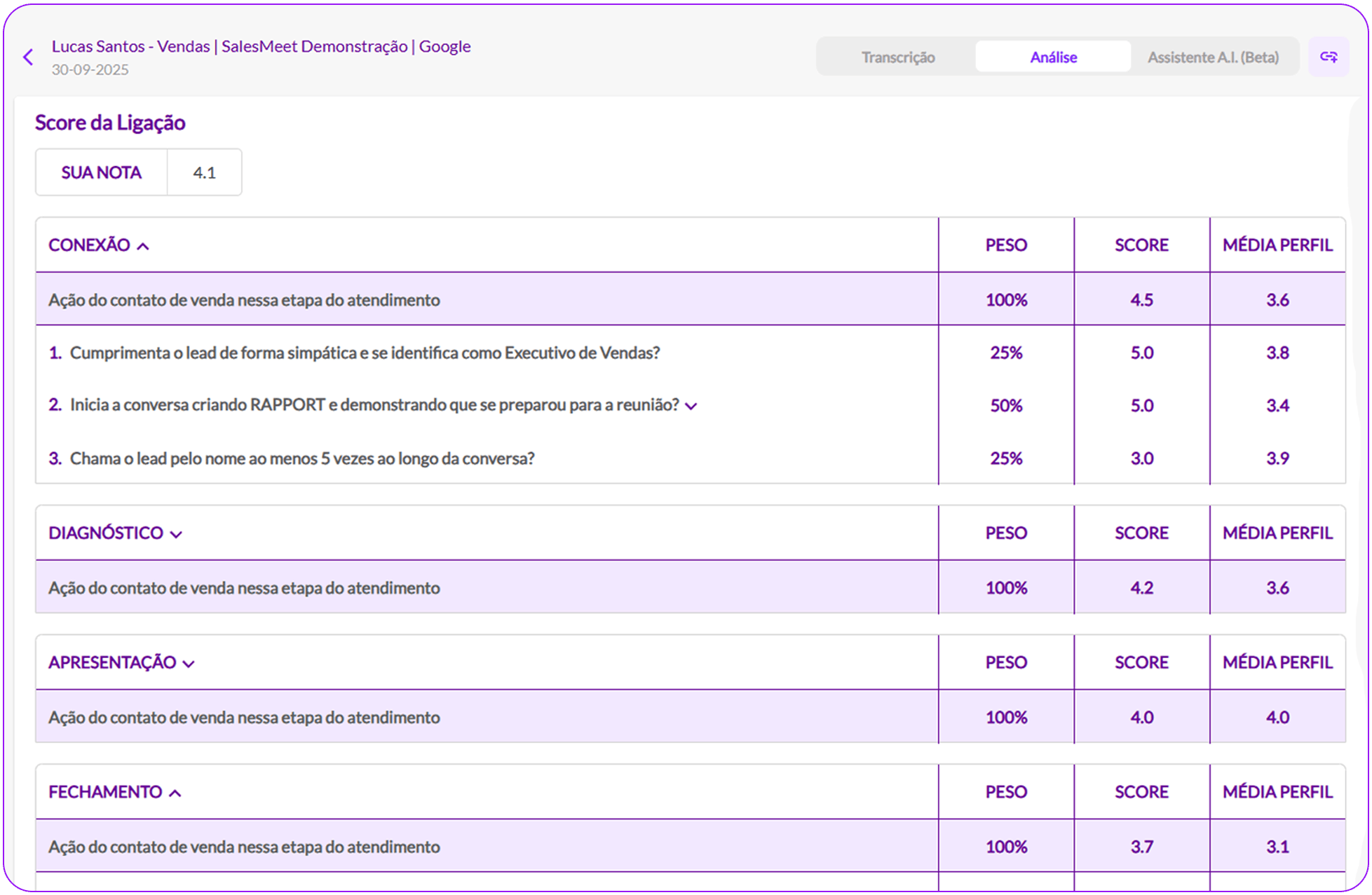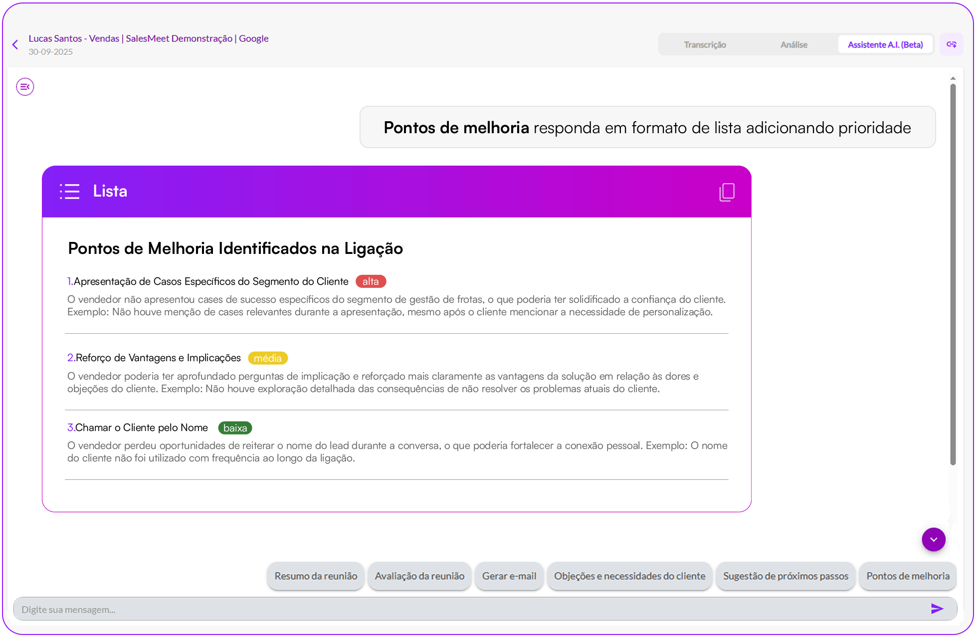 Unimos 18 anos de experiência em consultoria de Vendas com o poder da IA para criar Check-ups que analisam cada interação com profundidade. A SalesMeet interpreta evidências quantitativas e qualitativas das conversas, revelando exatamente o que faz o vendedor atingir a alta performance.
